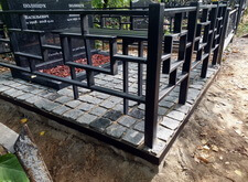 Клиент заказал у нас комплексное оформление места захоронения, в которое входят: классический горизонтальный памятник из чёрного гранита с прямоугольным цветником, простая металлическая оградка, а также наземное покрытие места захоронения гранитной брусчаткой. В первый наш приезд на кладбище могила выглядела следующим образом: два деревянных крестика и простое ограждение.